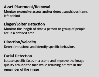 Sophisticated video analytics, once available as part of only the highest-end surveillance systems, are now part of every basic software package. Many single security cameras can offer analytic features including the ability to monitor expensive assest and/or detect suspicious items left behind, monitor the length of time a person or group are in a defined area, detect intrusions and identiry specific behaviors, and locate specific faces ina  scene and improve the image quality around the face while reducing bit-rate in the remainder of the image.